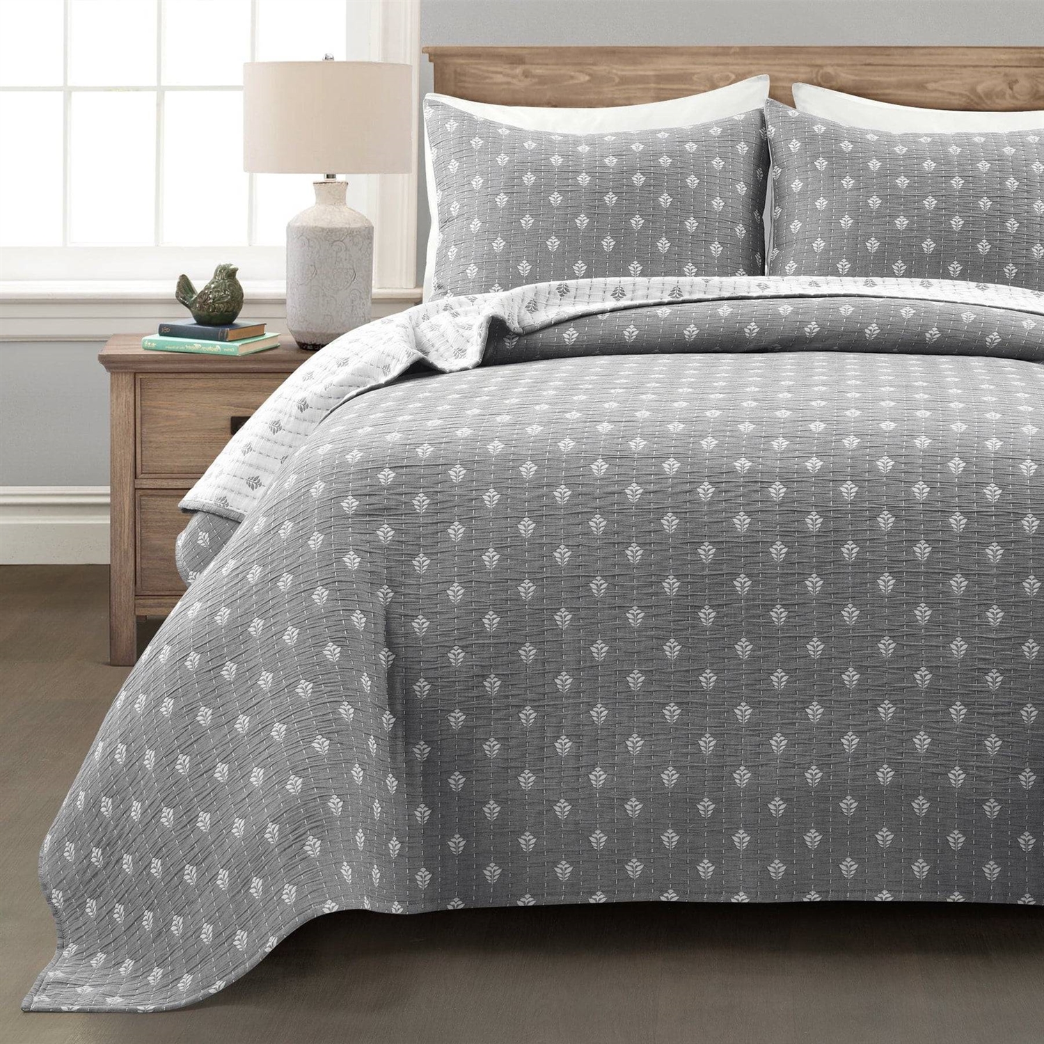 Full/Queen Size 3-Piece Reversible Cotton Yarn Woven Quilt Set in Grey and White