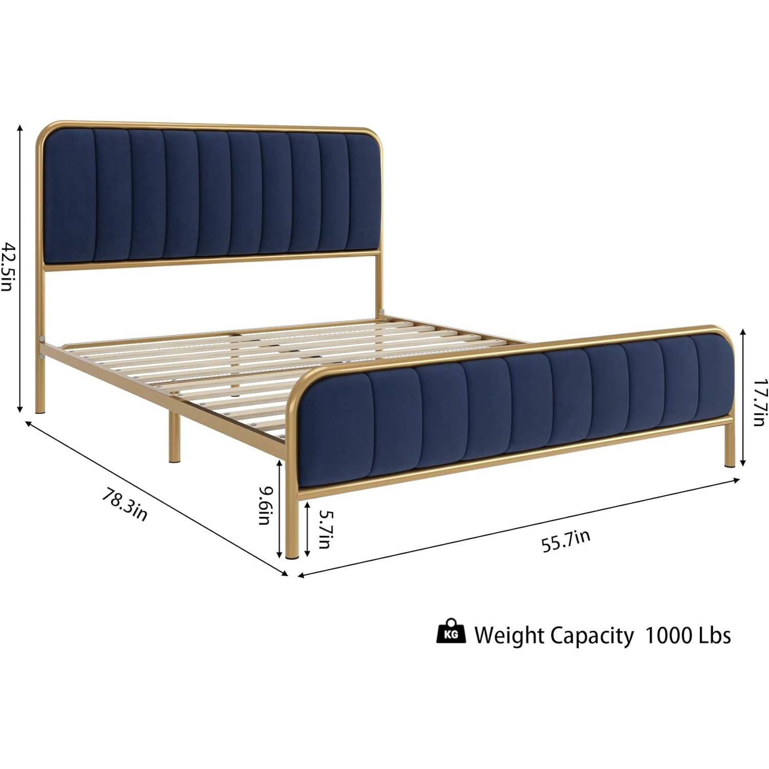 Queen Gold Metal Platform Bed Frame with Navy Blue Velvet Upholstered Headboard