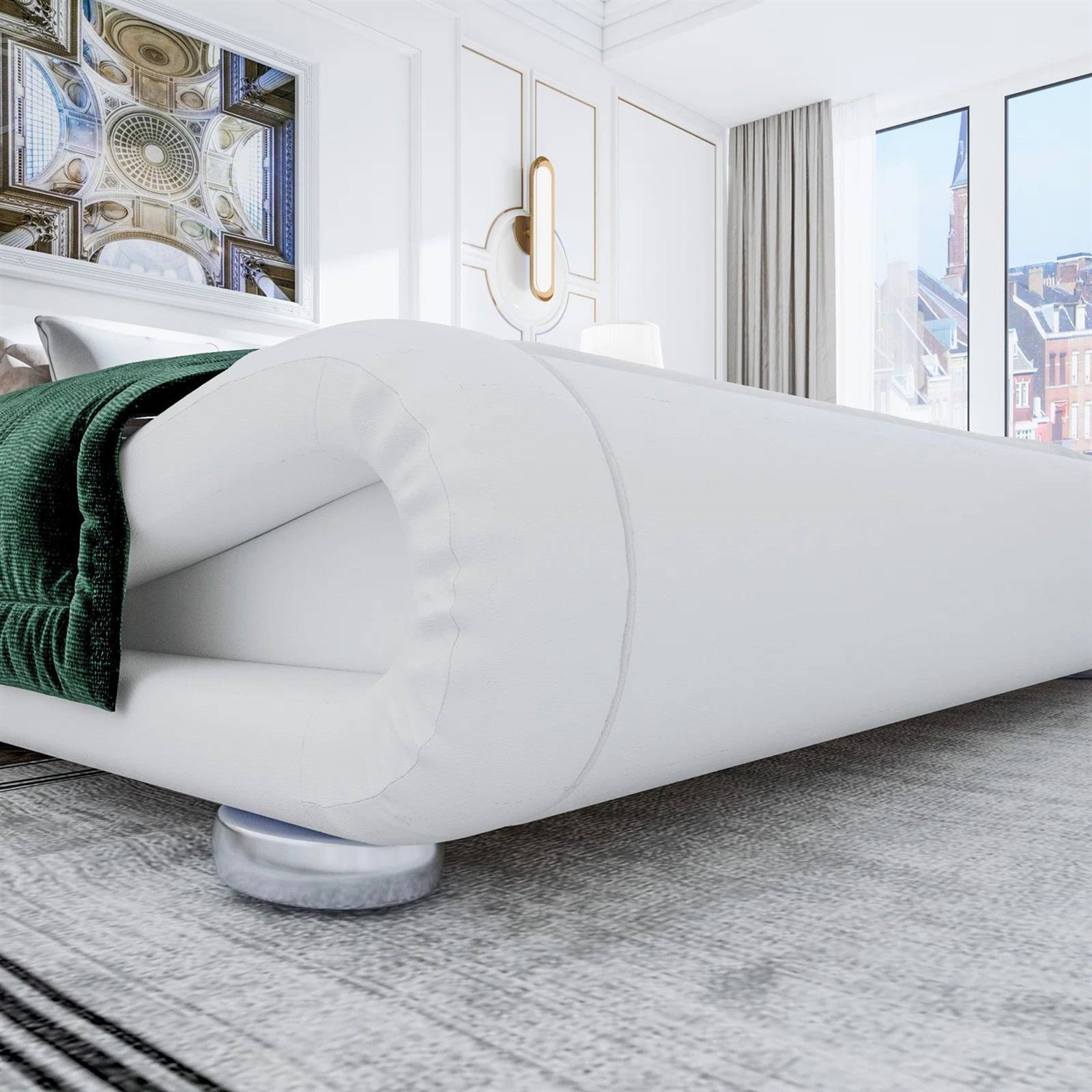 Queen Modern White Upholstered Platform Bed Frame with Sleigh Curved Headboard