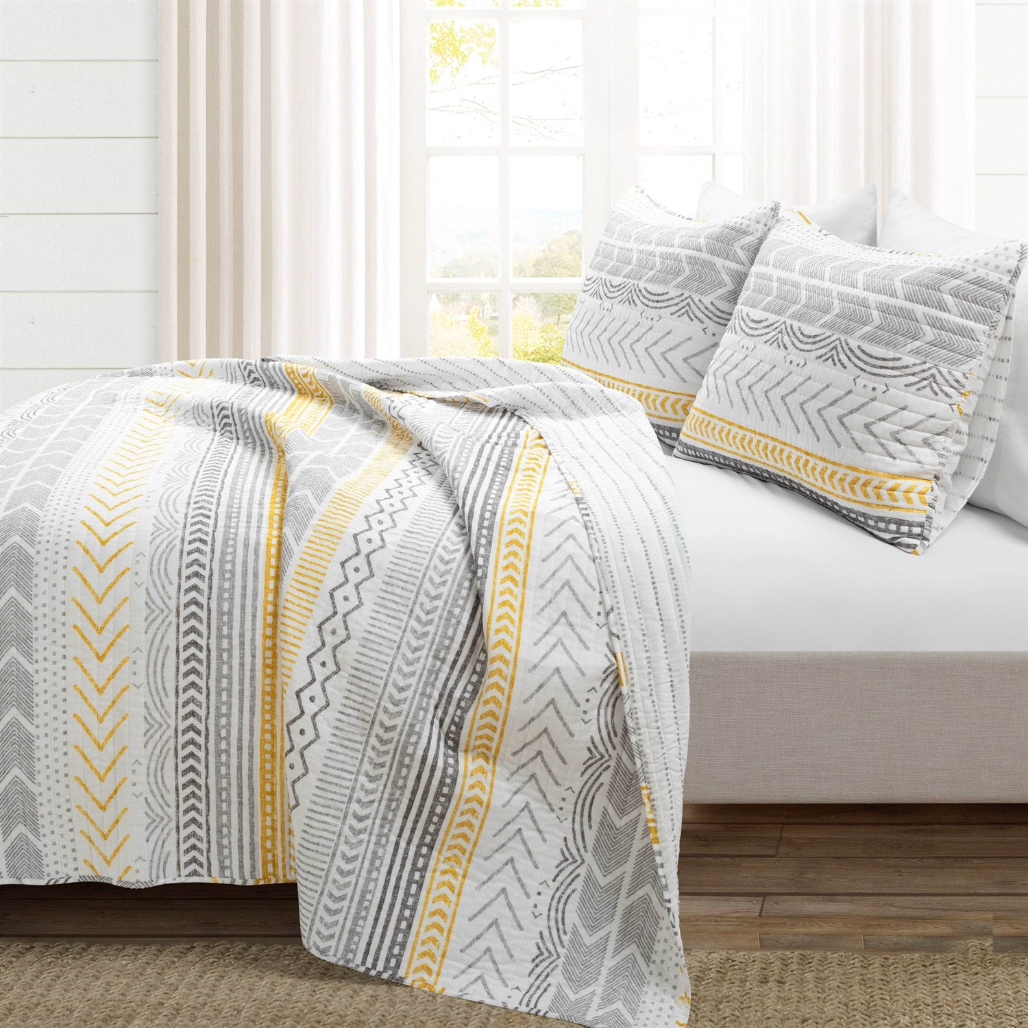 King Scandinavian Grey/Yellow/White Chevron Stripe Reversible Cotton Quilt Set