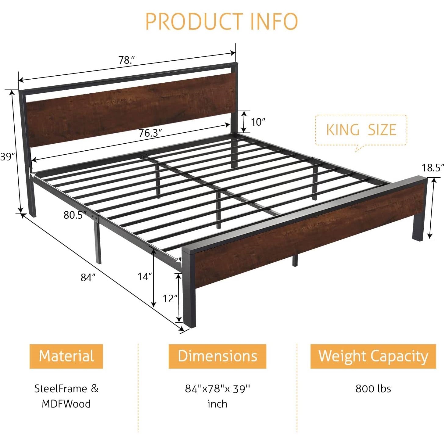 King Metal Platform Bed Frame with Mahogany Wood Panel Headboard Footboard
