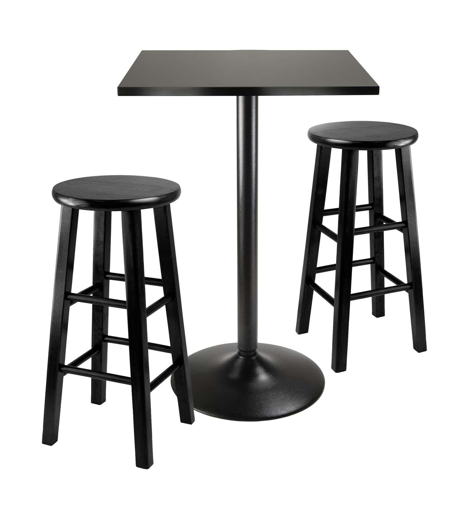 Obsidian 3-pc Counter Table Set comes with sleek and stylish all black Counter Height Table and two assembled 24" black square-leg stools. The round table top is black veneer on composite wood and the metal base has a black coating. Table size 23.6" Square by 34.6" high. Easy Assembly. Each Stool is 13.4"W x 13.4"D x 24.2"H Assembled. Table: 27.75x27.25x6.25; Table: 27.75x27.25x6.25;