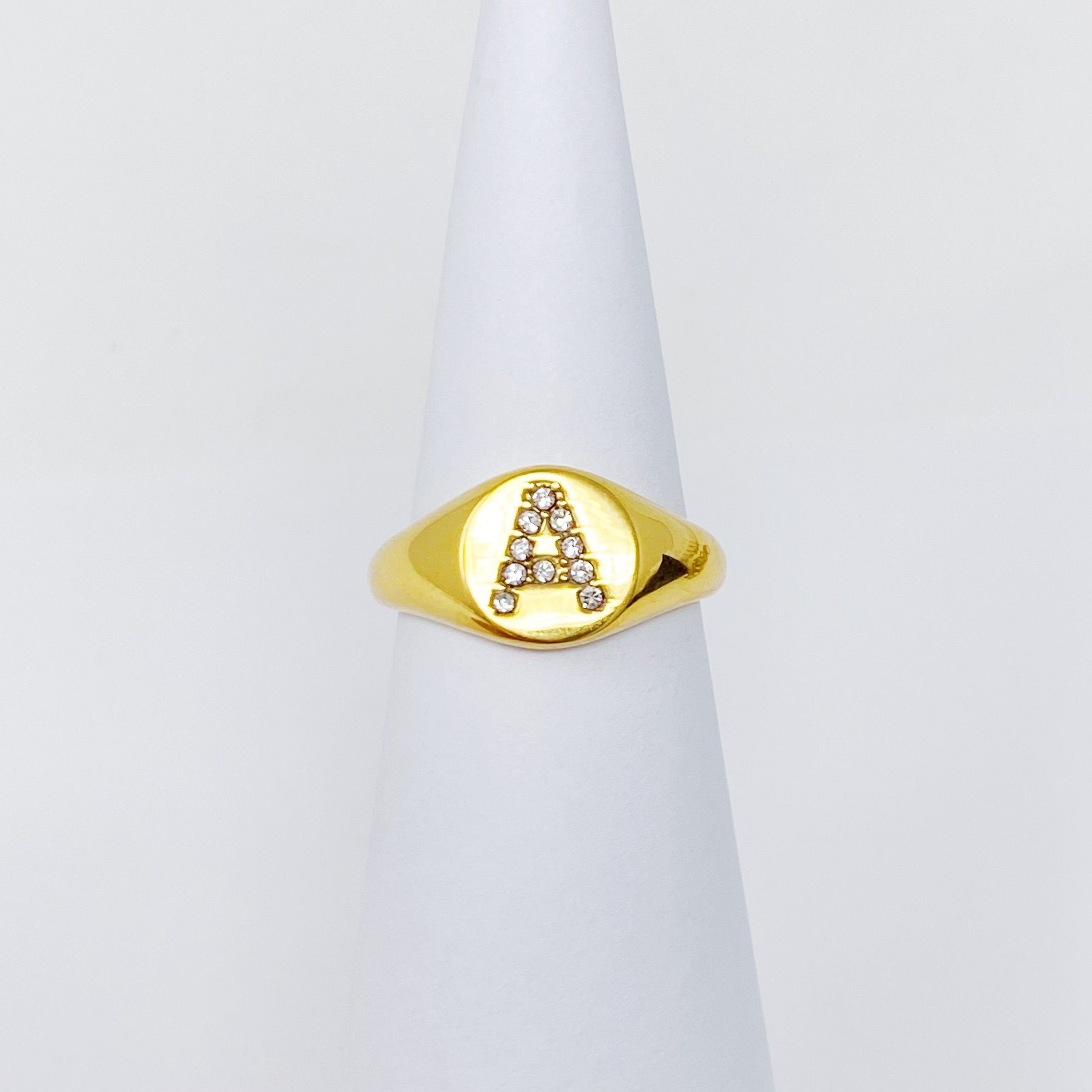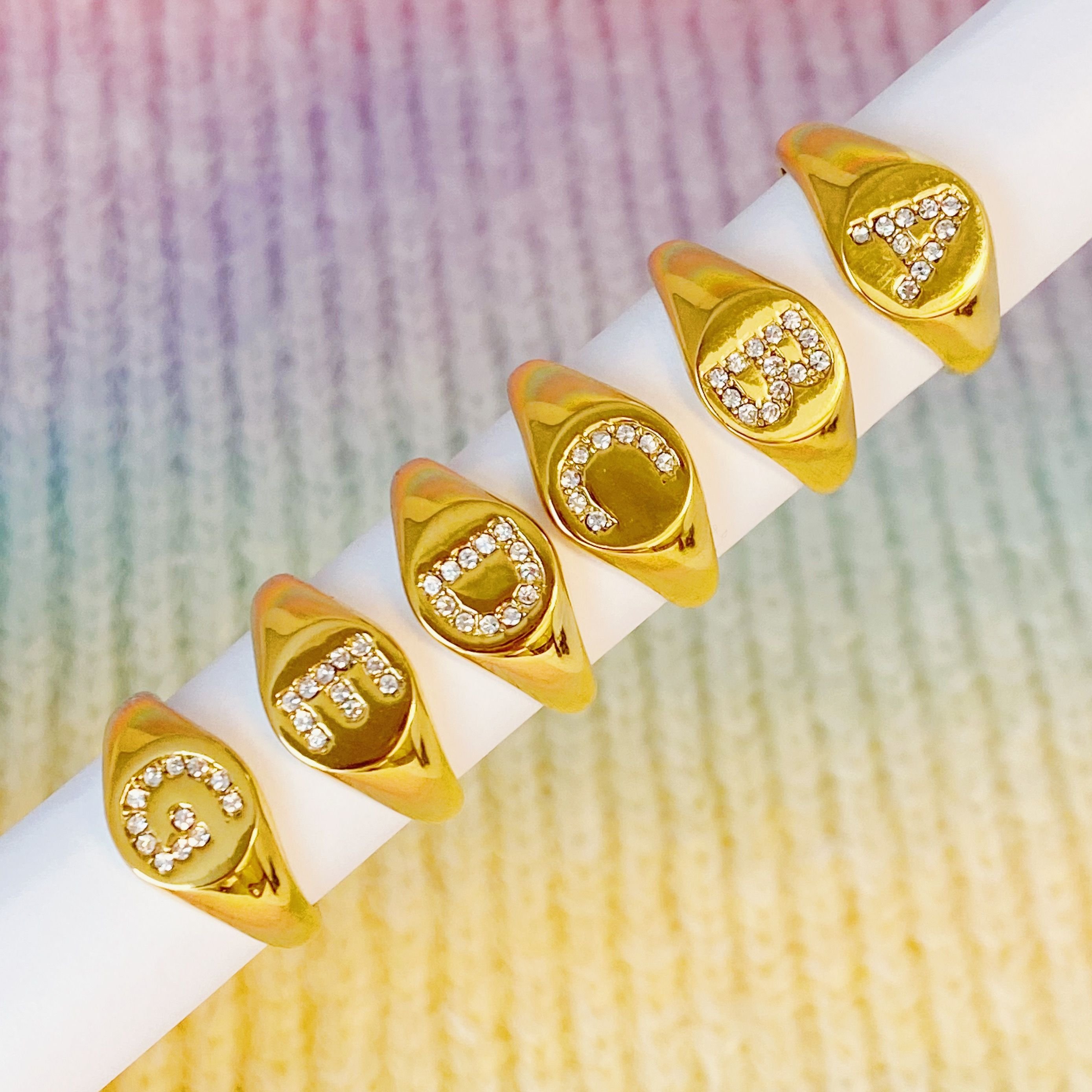 In style bold golden ring with initial paved with shiny stones. Popular 15 initials available